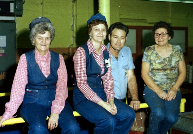 Employes from a jeans factory in the USA wear denim clothes in the 70s, lots of denim and denim and also a lot of ladies and girls in denim jean vests. Found in the internet.