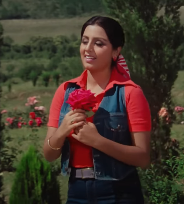 Hindu actress Neetu Singh with denim waistcoat in the 1976 Hindu movie BHALA MAANUS.