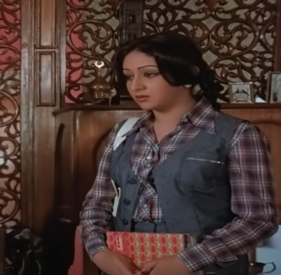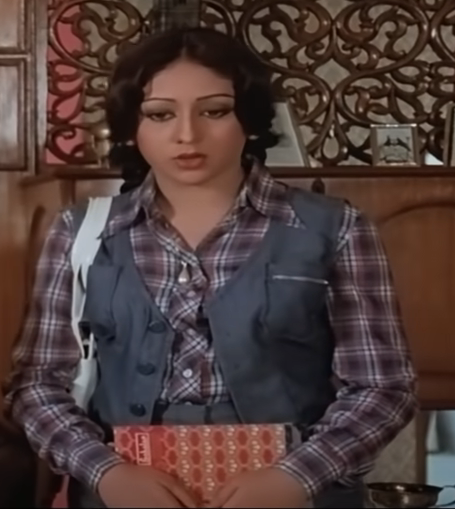 Hindu actress Bindiya Goswami in the 1978 KHATTA MEETHA, wearing a denim waistcoat.