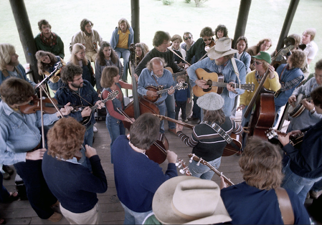 Multiphotograph Nick DeWolf took pictures in 1978 from a Jam of Bluegrass Musicians in Aspen, Colorado. Among them a bass playing woman, wearing blue jeans, red sweater and a denim vest.