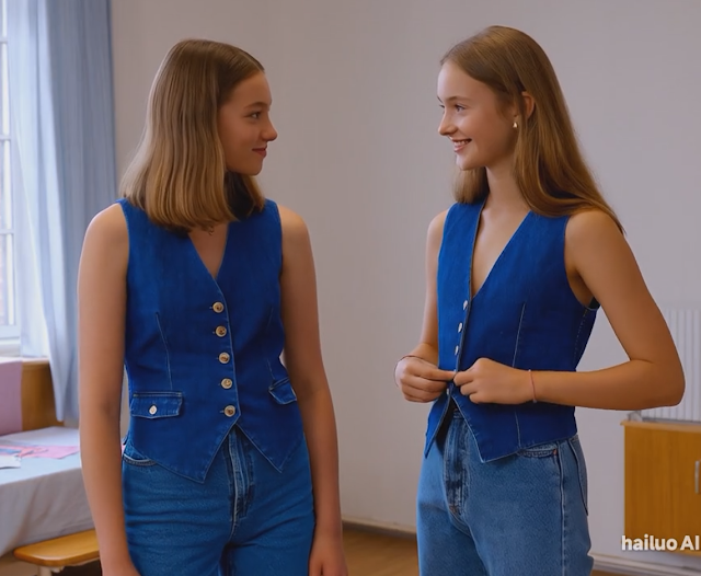While travelling through the endless spaces of videos generated by using artificial intelligence I met these young women from Sweden, wearing blue jeans and denim vests.