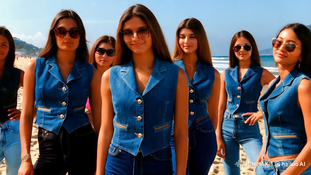While travelling through the endless spaces of videos generated by using artificial intelligence I met these young women from Brazil, wearing blue jeans and denim vests at the famous Copacabana beach in Rio de Janeiro 1977.