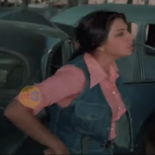 Hindu actress Neetu Singh wearing a denim waistcoat in the 1978 Hindu action movie KASME VAADE.