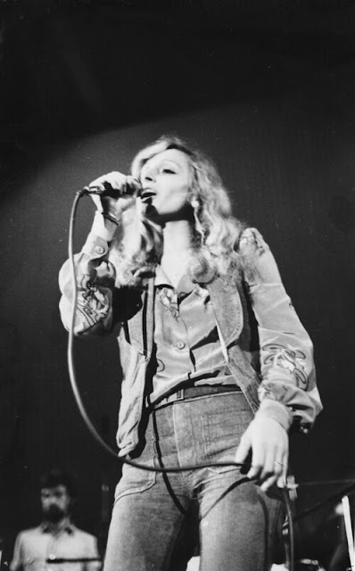 French singer Veronique Sanson wore a denim waistcoat lots of times while the years 1974 to 1977. Pictures were found in the WWW.